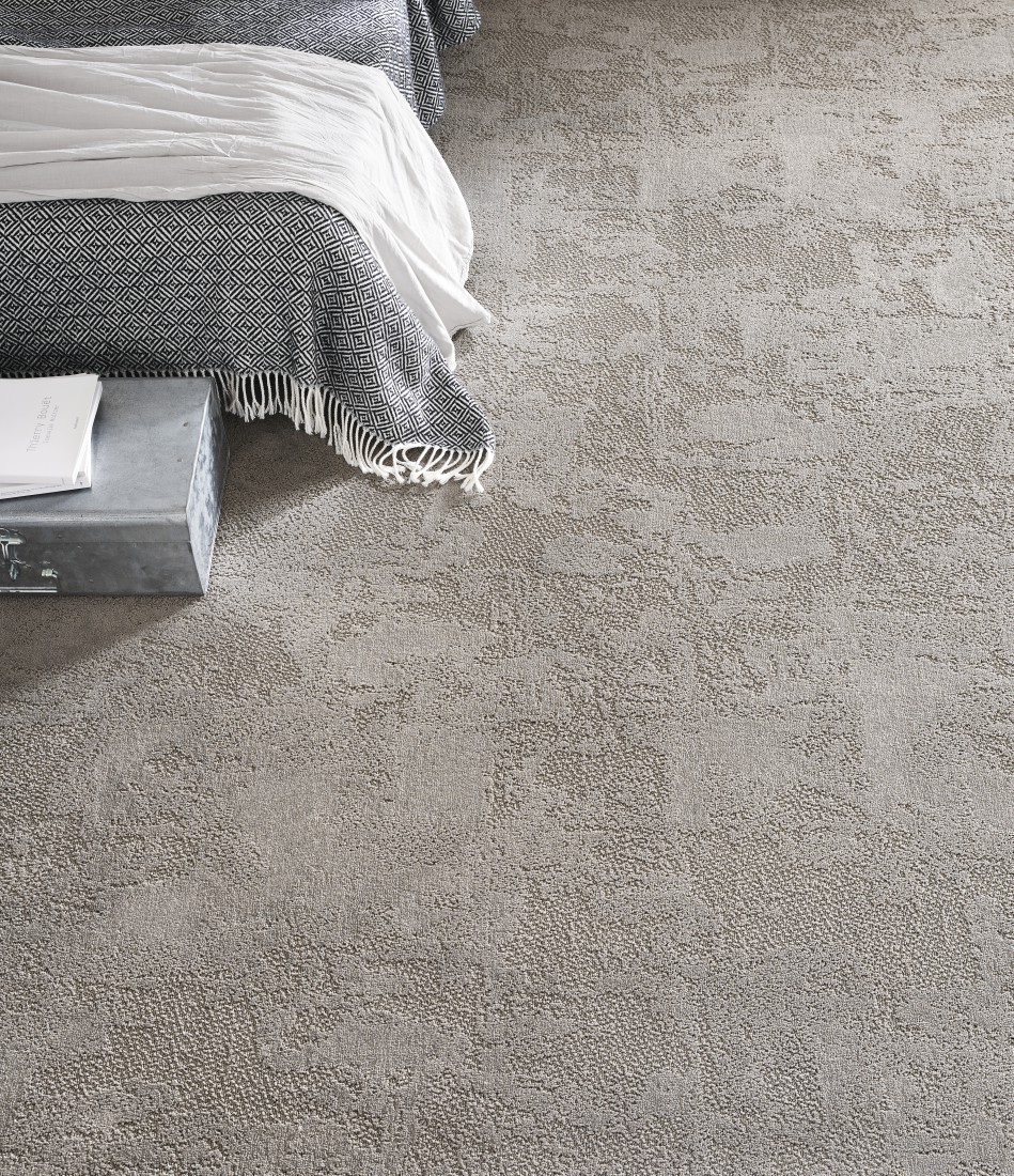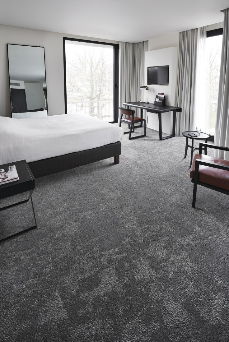 Het palet van dit royale, wolkenzachte tapijt met een poolgewicht van 1250 g/m² is uitgebreid en telt nu 14 tinten, waaronder nieuwe warme tinten (mahonie, theaterrood, goudgeel, enz.) als aanvulling op de minerale ambiances (granietbeige, leigrijs, sandelhoutbruin, enz.). Het bewegende motief is geïnspireerd op doorsnedes van kwarts of graniet. Het loopt op willekeurige wijze over de vloer, is zeer comfortabel en creëert een serene sfeer in hotelkamers of een kantoor.
