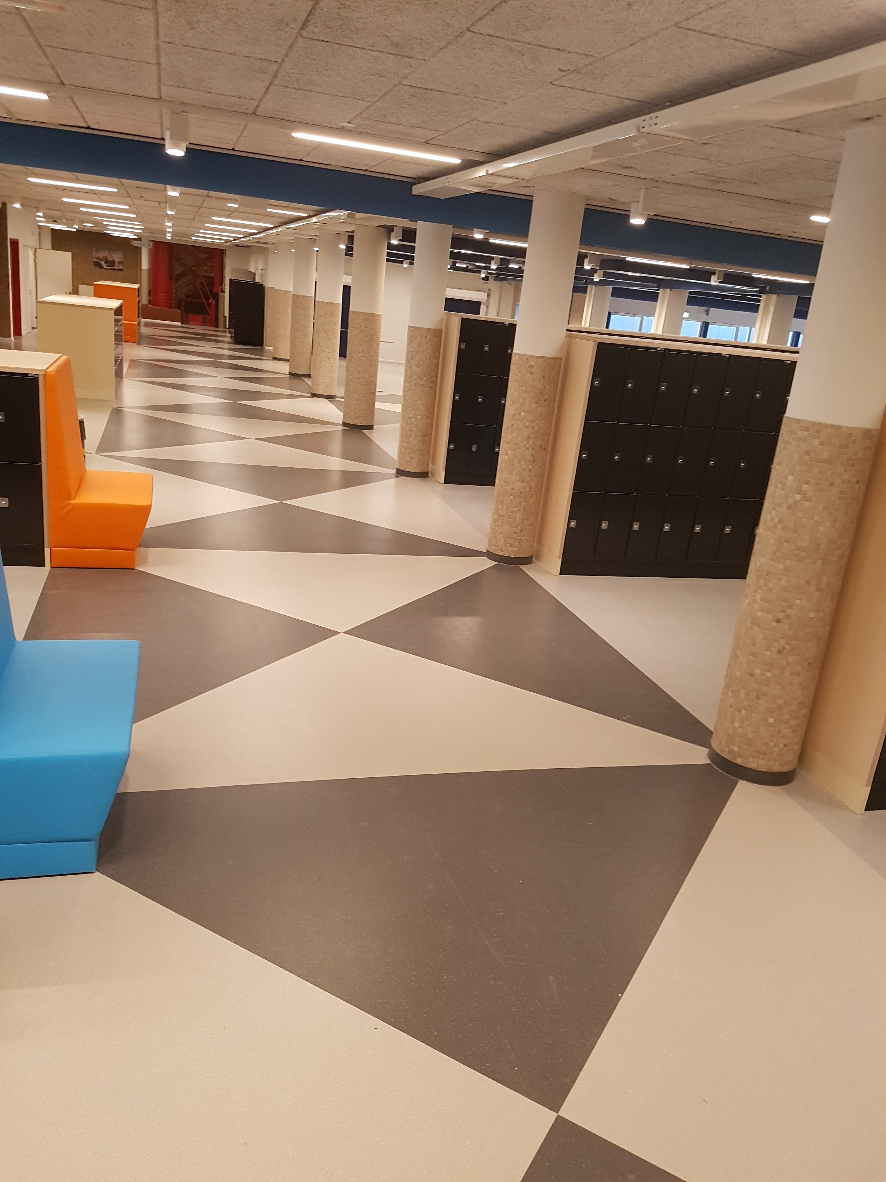 Voor CSG Willem van Oranje in Oud-Beijerland mochten wij, in samenwerking met Aannemingsbedrijf Fraanje en Architektenburo Roos en Ros, de entreehal en aula voorzien van een volledig nieuwe vloerafwerking. Deze centrale ruimtes waren toe aan een frisse, eigentijdse uitstraling die past bij de dynamiek vaneen scholengemeenschap. Tijdens de ontwerpfase werd duidelijk dat de vloer bestand moest zijn tegen intensief dagelijks gebruik door honderden leerlingen en medewerkers. Onze keuze viel daarom op een rubbervloer van Artigo, type Zeus, uitgevoerd in drie kleuren. Rubbervloeren hebben meerdere voordelen: Uitermate duurzaam: bestand tegen intensief loopverkeer zonder kwaliteitsverlies. Natuurlijk product: rubber is een natuurproduct en gedurende de hele levenscyclus CO₂-neutraal. Comfortabel & veilig: veerkrachtig en slipvast, wat het comfort en de veiligheid verhoogt. Designvrijheid: patronen en kleurcombinaties zijn uitstekend te integreren in moderne ontwerpen.