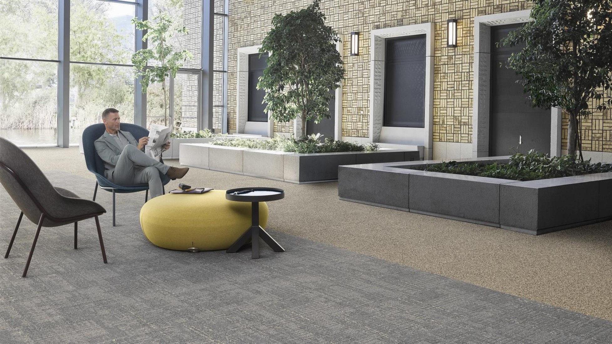 DESSO AirMaster Tierra Gold tapijttegels verminderen concentratie van fijnstof in de binnenlucht. En verbetert de luchtkwaliteit in het gebouw.